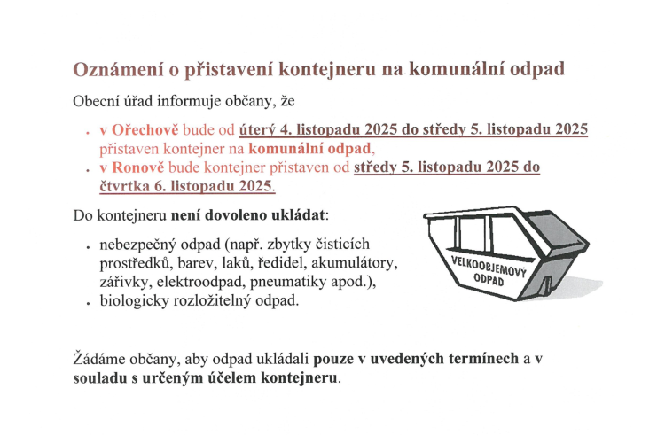 Oznámení pro občany 15.9.2025 Obec Ořechov oznamuje, že v místní prodejně Ořechovka bylo zřízeno výdejní místo společnosti PPL. Na tomto výdejním místě si nyní můžete: nechat… Číst více