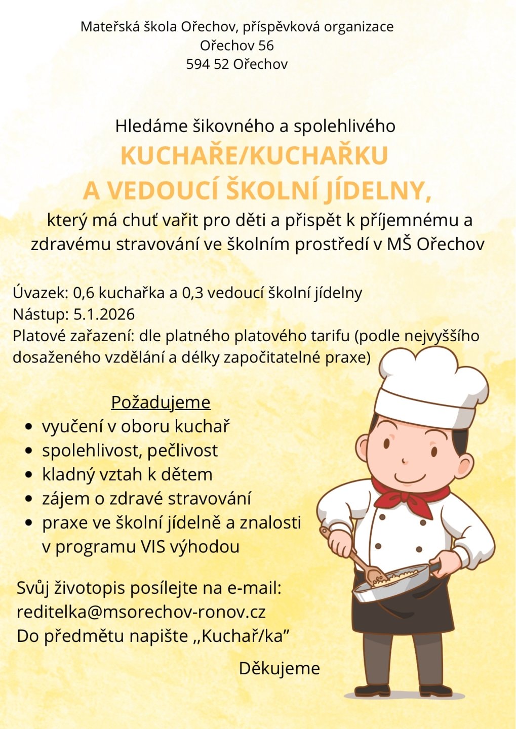 Mateřská škola Ořechov hledá kuchaře/kuchařku na pracovní poměr od 5. 1. 2026.