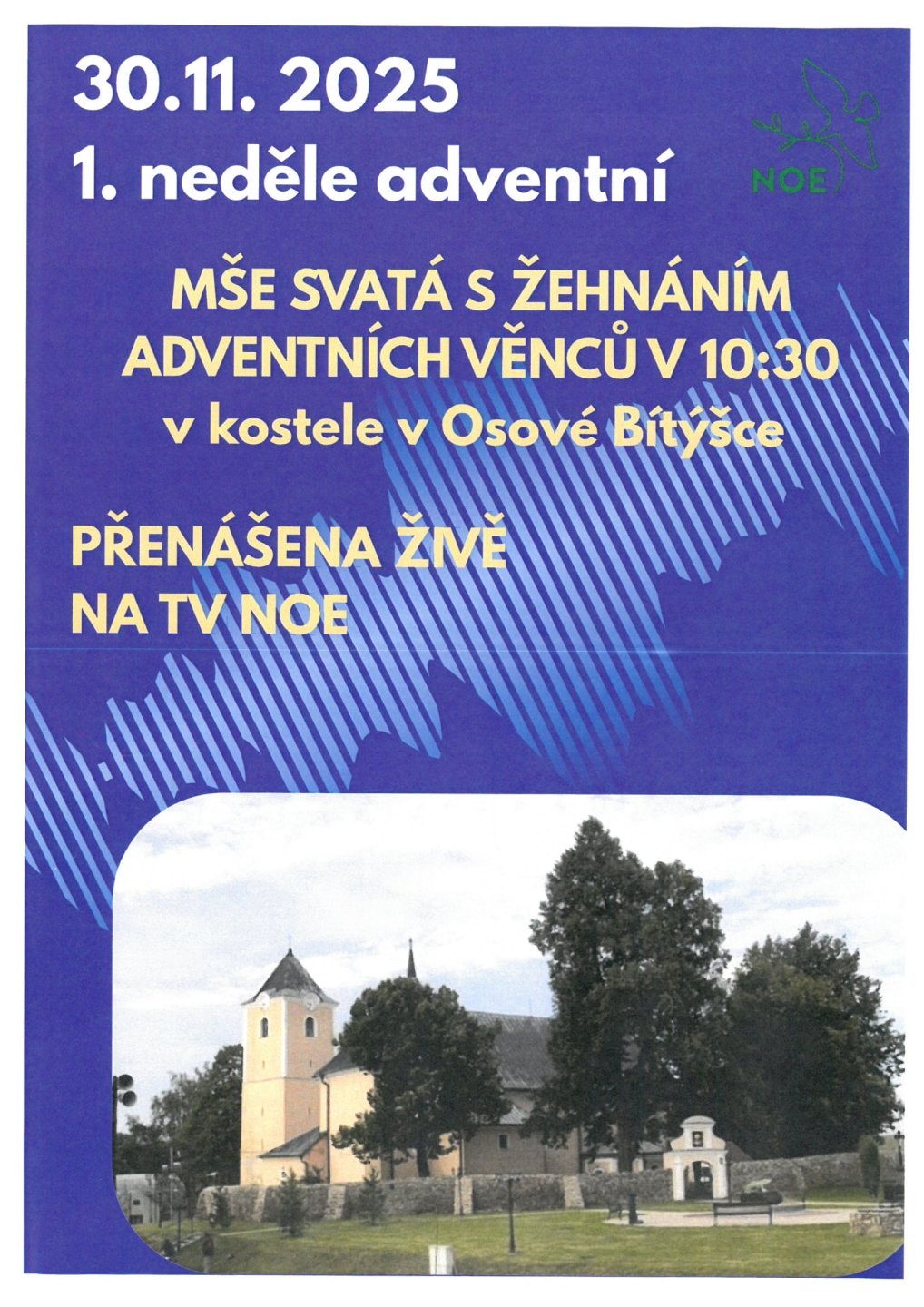 Oznamujeme občanům, že v neděli 30. listopadu 2025 v 10:30 hodin se bude v kostele v Osové Bítýšce konat mše svatá s žehnáním adventních věnců.Tato mše bude přenášena živě na televizi TV NOE.